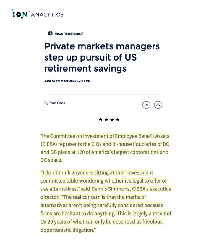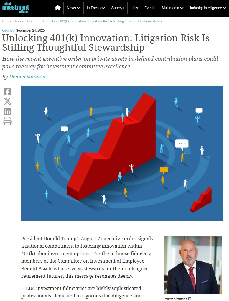 CIEBA Executive Director, Dennis Simmons, recently spoke to Mergermarket, a service of ION Analytics, about the importance of needed ERISA litigation reform, particularly in the context of prudently considering alternatives in 401(k) plans.