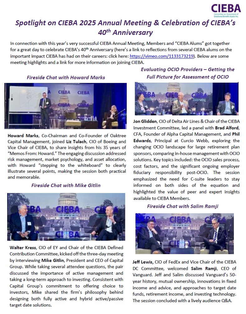 CIEBA, the Committee on Investment of Employee Benefit Assets, represents 120 of the country's largest pension and defined contribution trusts. Its members manage more than $2.5 trillion of defined benefit and defined contribution plan assets on behalf of more than 16 million participants and beneficiaries. As the largest organization of private plan investment officers, CIEBA represents the interests of chief investment fiduciaries of employee benefit plans in front of legislators, Congress, regulators, and the media. Click here to learn more. Recent Meeting HighlightsSpotlight on CIEBA 2025 Annual Meeting & Celebration of CIEBA’s 40th AnniversaryClick Here to Read the ArticleSpotlight on our June 2025 Working Group Meeting